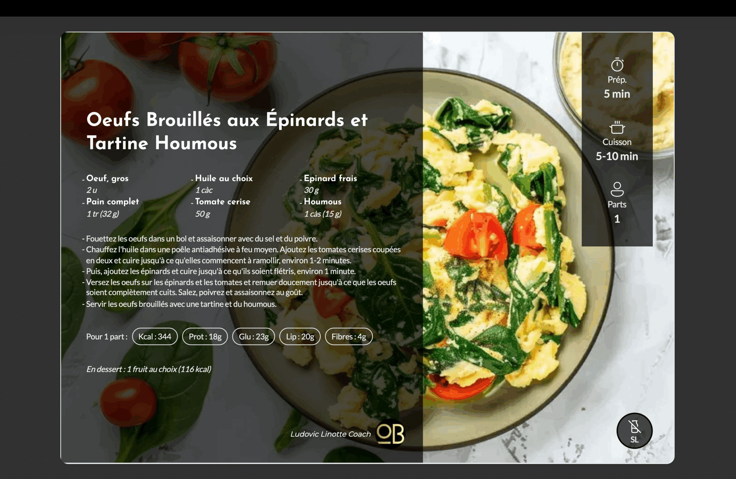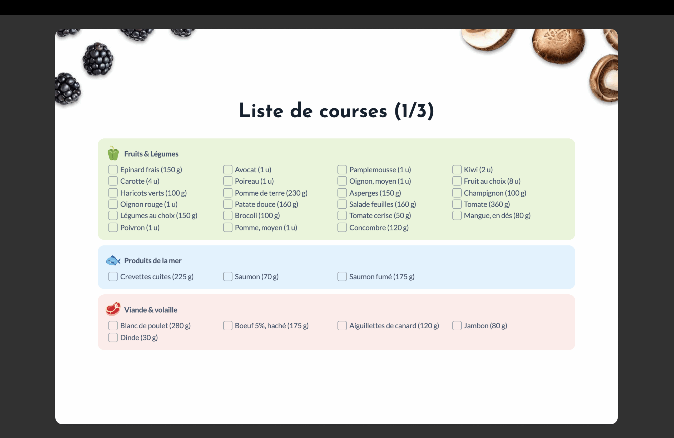• Menus et Recettes Simples : Des menus équilibrés avec des recettes faciles à réaliser et des listes de courses pour simplifier ton organisation.