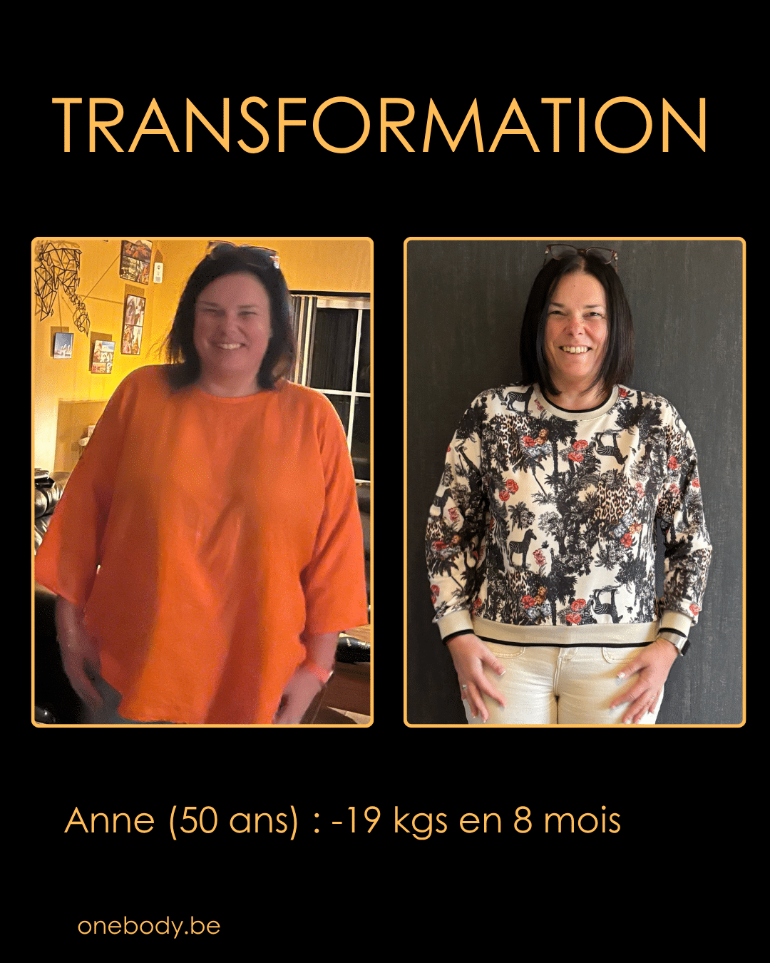 « Le coaching OneBody m’a aidé à perdre du poids (19 kgs) et à retrouver la forme en 8 mois seulement ! «  – Anne, 50 ans